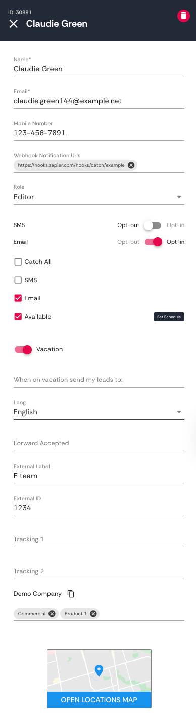 - External ID: A company’s own ID that can be used for tracking and identifying agents. External ID should be unique and can be used to designate agents for updates or lead offers.